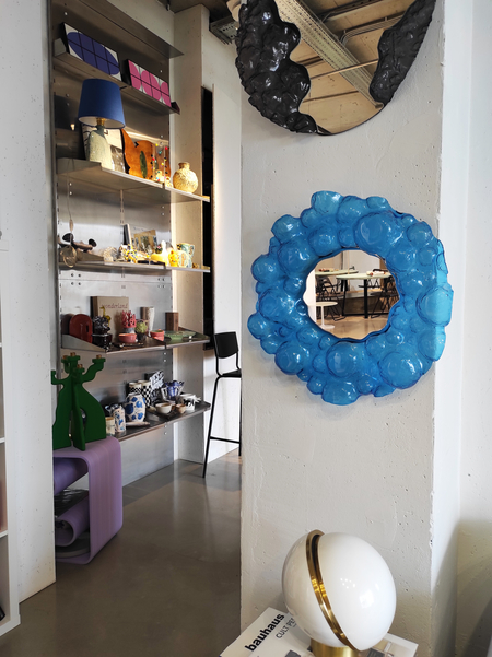 The size of the Bubble mirror is 5050 cm It is also available in a large size — 1m50 cm The glass frame is created in the technique of mollification. Manual cutting of the mirror cloth.