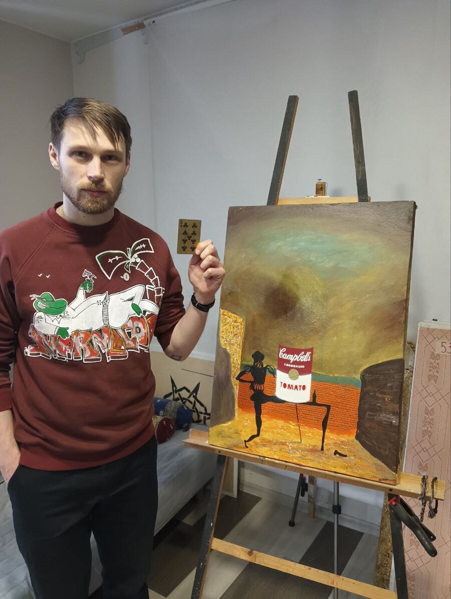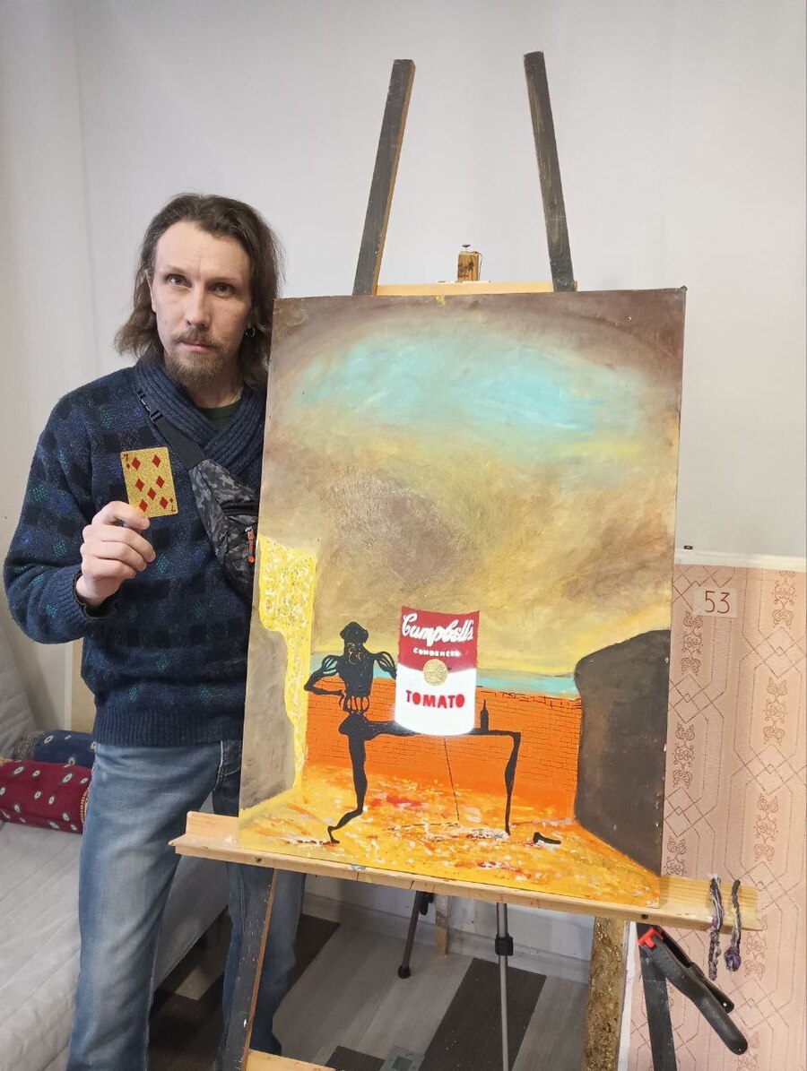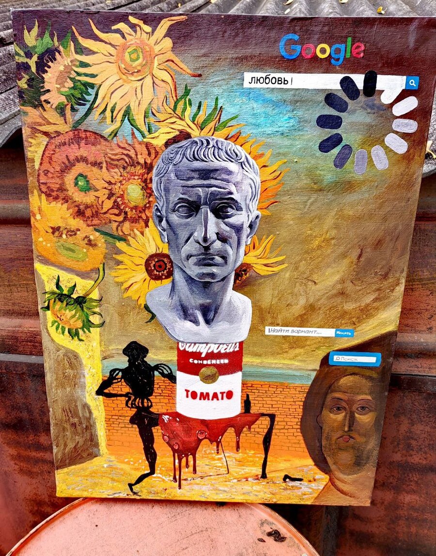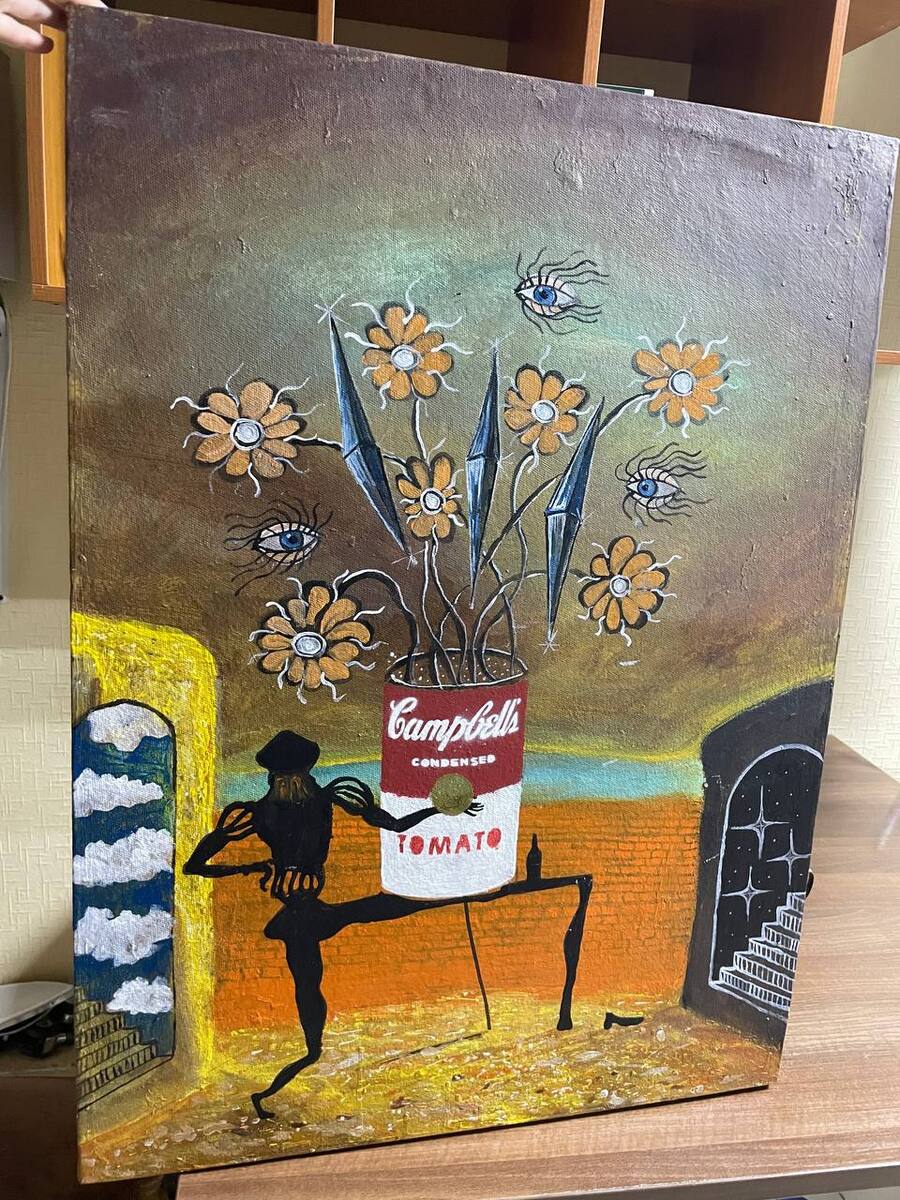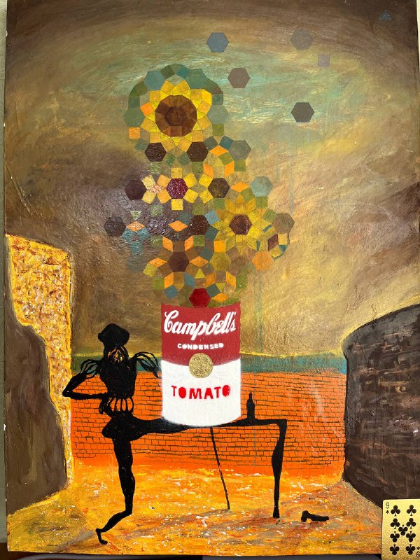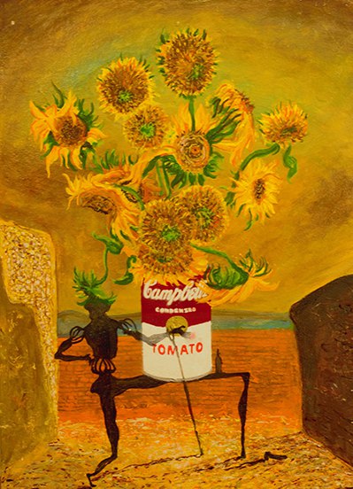 * КОНЦЕПЦИЯ КАРТИНЫ Автор не рассказал точный смысл задумки. На фоне — картина Сальвадора Дали, «Призрак Вермера Делфтского, который может служить столом», на столе — банка с картины Энди Уорхола «Банки супа Campbell’s», являющейся вазой для подсолнухов Винсента Ван Гога.