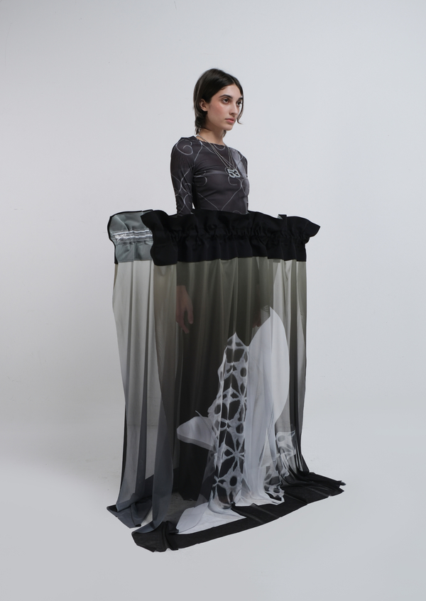 В основу принта легли фикусы и кружевные шторы, которые становятся атрибутами обычной жизни и быта. А также решетки окон, выступающие перегородкой между внешним миром и частной жизнью, дающие ощущение защищенности, но вместе с этим и заточающие в клетку.