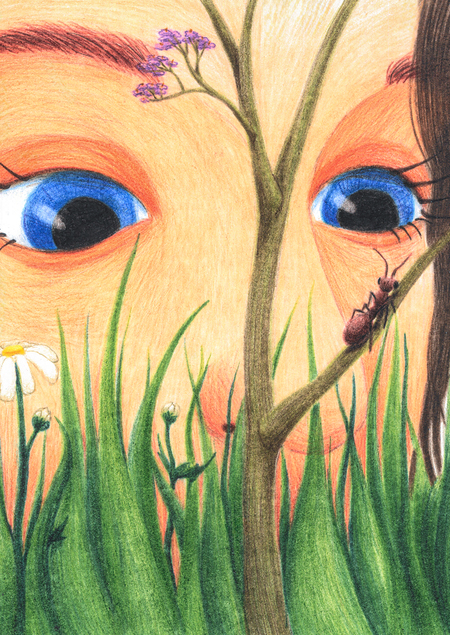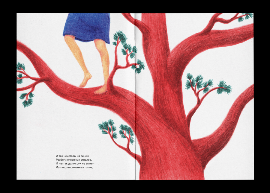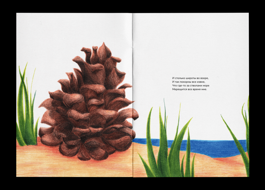 Героями моих иллюстраций к стихотворению Бориса Пастернака «Сосны» стала природа: деревья, цветы, волны, насекомые и дети, так как именно в детстве восприятие мира вокруг нас является самым красочным. Для того, чтобы нагляднее показать происходящее в стихотворении действие глазами детей, я выполнила свои иллюстрации карандашами, использовав яркие и насыщенные цвета.