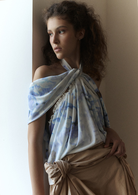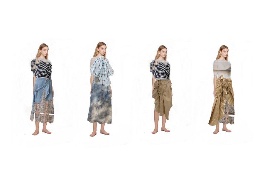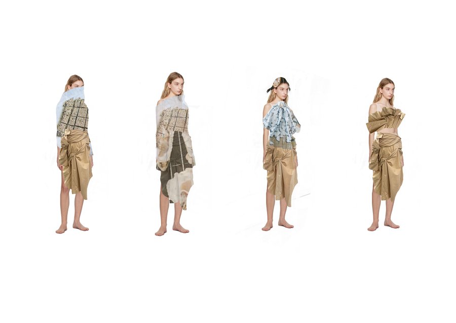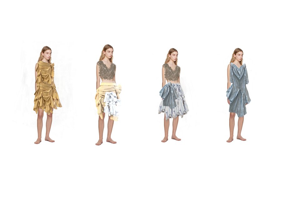 Опираясь на референс, решила делать детали на юбках из узлов, которые получаются, когда люди завязывают фартук, готовя завтрак или повязывают любимую кофту на пояс. Также в основу коллекции легли манипуляции со складками, которые случайно образуются, когда человек укутывается в плед или шарф.