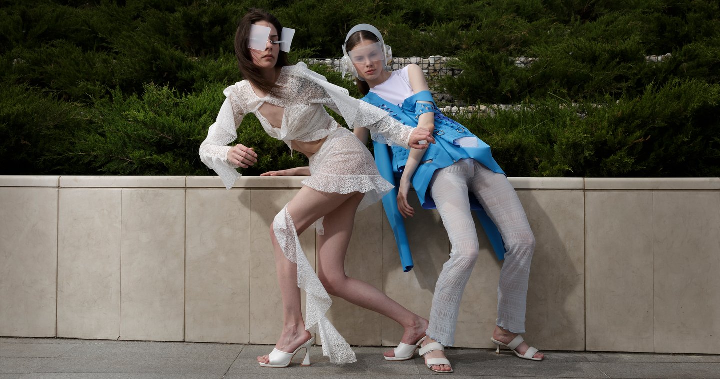 В коллекцию вошли изделия из переработанного пластика: платье и юбка из пакетов, топ и юбка с использованием пайеток из пластика. Футболка и мини-юбка созданы с помощью лазерной резки.