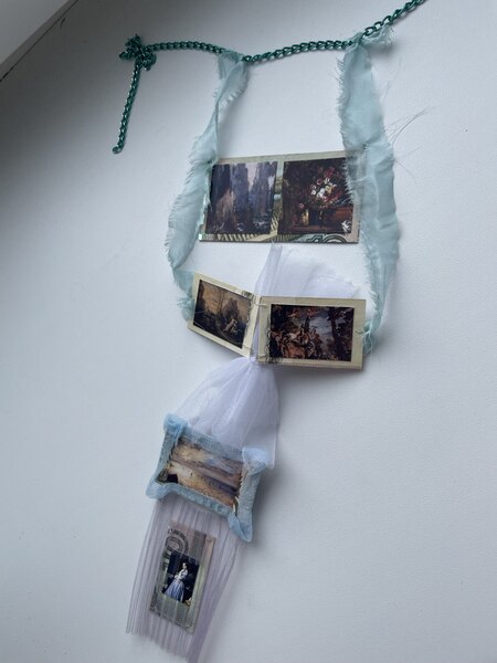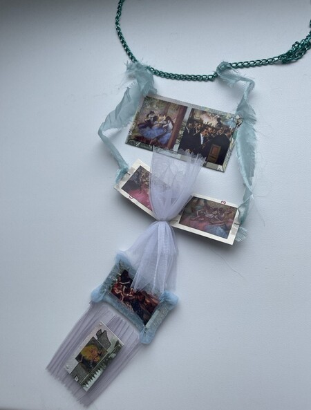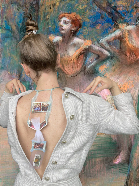 Идея аксессуара построена на следующем принципе: в нём объединено всё то, что любит художник и пронизано символом. На одной стороне изображены работы художников, которых он глубоко ценил и покупал их работы, на другой стороне — его собственные полотна. Паспарту сделаны из денег, как обменная валюта произведениями искусства. Также, они скреплены недолговечными материалами, шелком и алюминиевой цепью, в параллель с тем, что художник сам не думал о долговечности своих полотен, используя пастель. Также аксессуар надевается на самое часто изображаемое место тела танцовщиц — их спину. Можно было бы надеть аксессуар на каждую вторую картину художника.