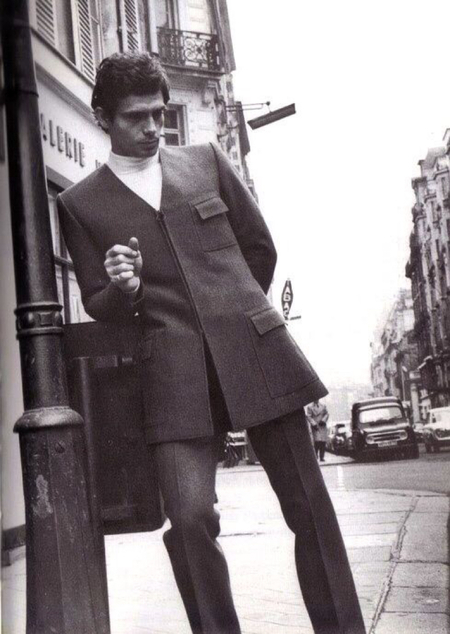 Карден совмещает различные фактуры, создает полускафандры-полусовременные платья. Мужские костюмы Карден видел как продолжение того, что существует в женской моде. Мужской костюм должен был освободиться от оков классики. У пиджака могло не быть лацканов, но будет воротник-стойка
