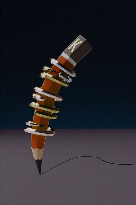 Рекламные плакаты нашего бренда представляют абсурдные и нереалистичные композиции с карандашами и стопкой книг. Эти изображения отсылают нас к временам усердной учёбы и работы.