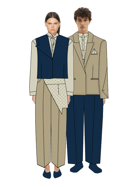 Используемые ткани: Рубашка из джинсы — 100% хлопок Рубашка — натуральные ткани (хлопок, хлопок+шёлк) Брюки — тонкая костюмная шерсть Жилет — тонкая костюмная шерсть, подкладка — 100% вискоза Юбка — тонкая костюмная шерсть, подкладка — 100% вискоза Металлический бейдж с нанесением имени
