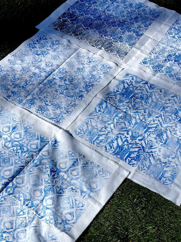 Для работы автор изготовил набойки с помощью технологии линогравюры. Для окрашивания использовалась краска для шелкографии на водной основе. Паттерн было решено наносить вручную для создания более акварельного, природного эффекта.