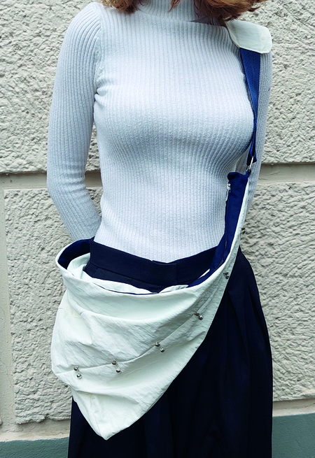Сумка вдохновлена космическим скафандром «Сокол». Основой для формообразования послужило крыло космического корабля «Буран». Декоративные элементы напоминают заклёпки, которые применяются для соединения металлов.