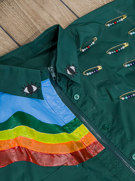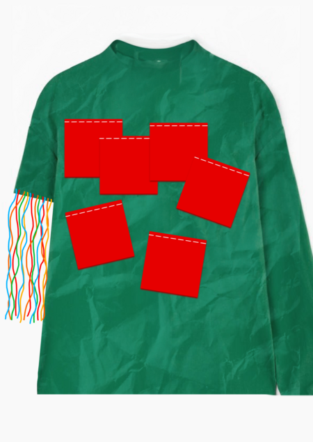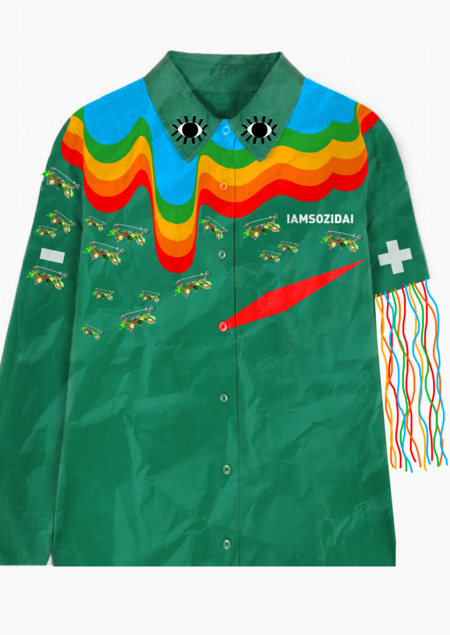 What are we like? What would an identity look like if it were a shirt? Visualization of personal qualities as a self-image, senses and images have been moved to the range of the shirt. Among them are rainbows, which come after rain and which come with waves of inner state; self-segregation, expressed in a stitched sleeve; double syllables, as mood swings; eyes, as a habit of building up, linked to the pseudonym ismozidai; pins, both sharp and bright at the same time, etc.