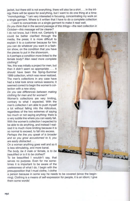 «Потому что я действительно пытаюсь изобразить то, что они чувствуют, и часто это не очень хорошо. Мне слишком легко просто сделать так, чтобы женщины выглядели желанными, как их видят мужчины… Я считаю женщин инвалидами в этом смысле. Я стараюсь включить страдания и уязвимость в женские коллекции. Вся эта чушь, через которую проходят женщины. Это не так красиво. Женщины всегда сильнее, может быть, даже я их немного боюсь»
