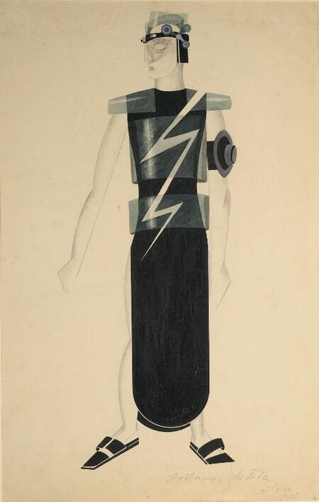 Георгий Клуцис создавал уникальные проекты одежды, сочетающие в себе элементы супрематизма и конструктивизма. Его творения отличались использованием геометрических форм и ярких цветовых сочетаний. Он создавал костюмы, в которых конструктивные элементы служили не только декоративным, но и функциональным целям, способствуя артистам в их пластике и движениях.