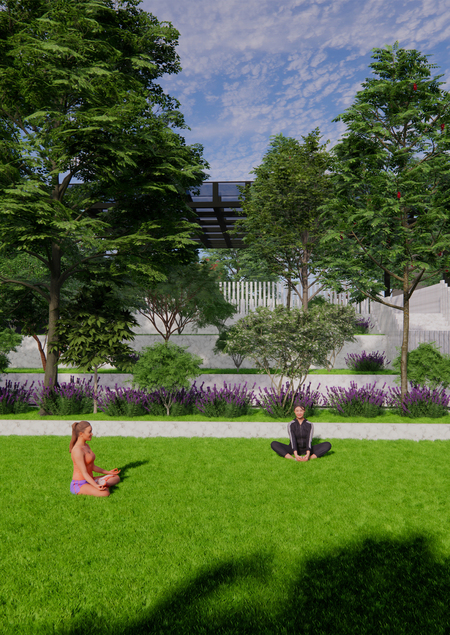 Пространство создано для духовного развития и размышления. Включая в себя элементы дыхательных практик на йоге и физической занятия для медитации на гамаках. Также созданы зоны для отдыха и прогулки. Специальная комната тишины.