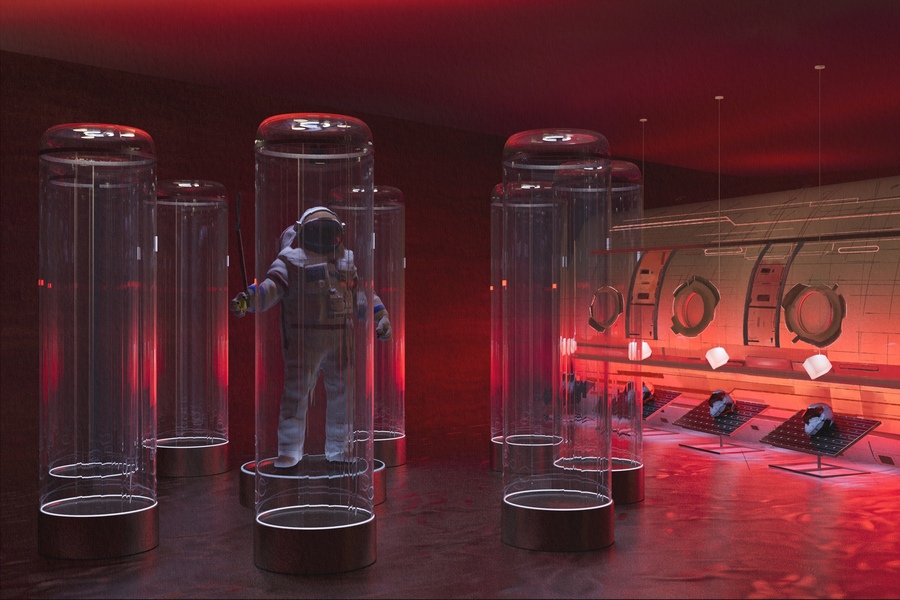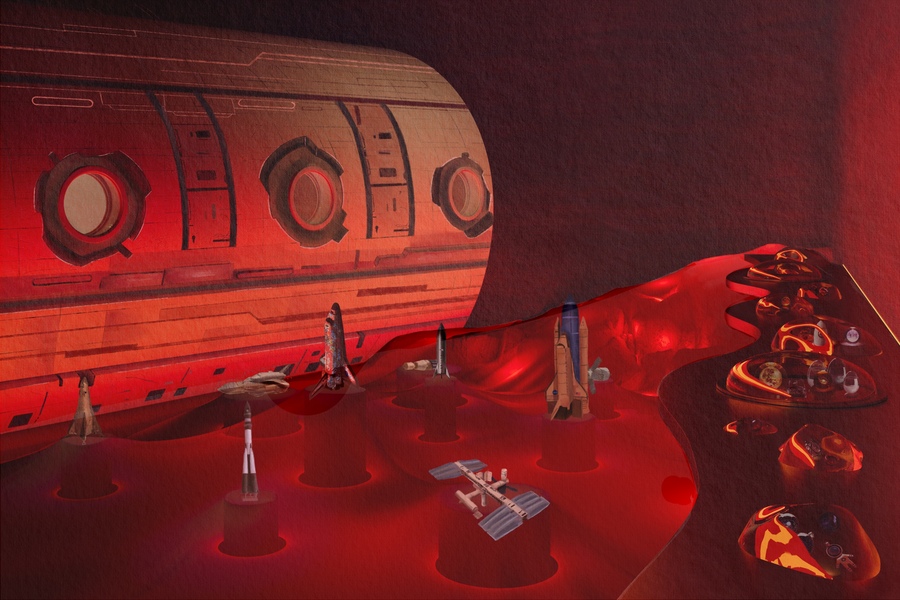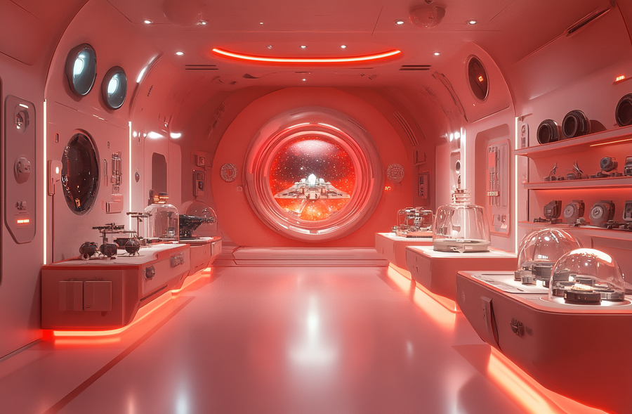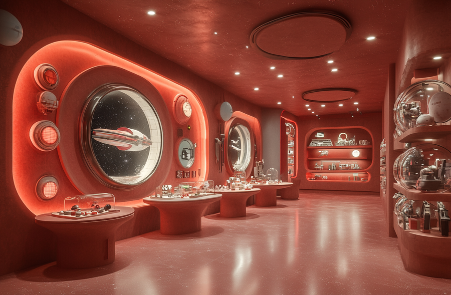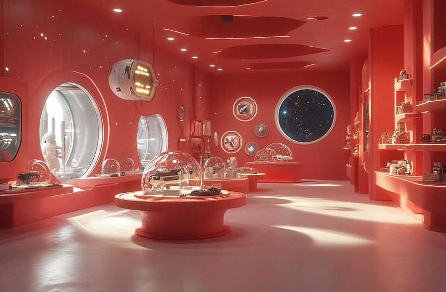 Промт: Realistic interior design of a space goods store. A red room in the center of which is a light red installation with several small tables on which various objects can be placed. Each table has one model of a space station in the center and is surrounded by other models, such as spaceships, aliens or human figures. On the left is a space gateway with several portholes. A red neon light illuminates the interior of an air tank with multiple buttons and round windows. A white fabric sheet is stretched over it. On the right along the wall is a shelf with space goods under several glass spheres of different shapes. The walls have large windows through which you can see stars and galaxies. In some places there will also be various futuristic tools. The whole scene has the appearance of being made from plasticine, and the lighting casts shadows around the room, creating a mysterious atmosphere. The overall mood evokes a feeling of calmness and tranquility, with a color palette that includes shades of dark gray and soft pink. Сorona render --ar 20:13