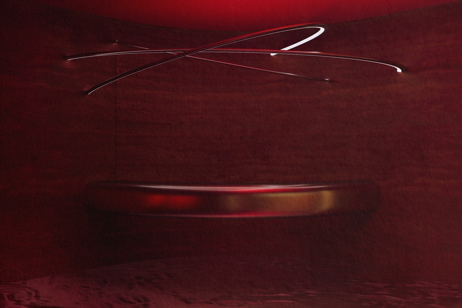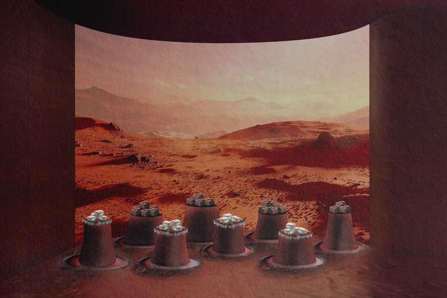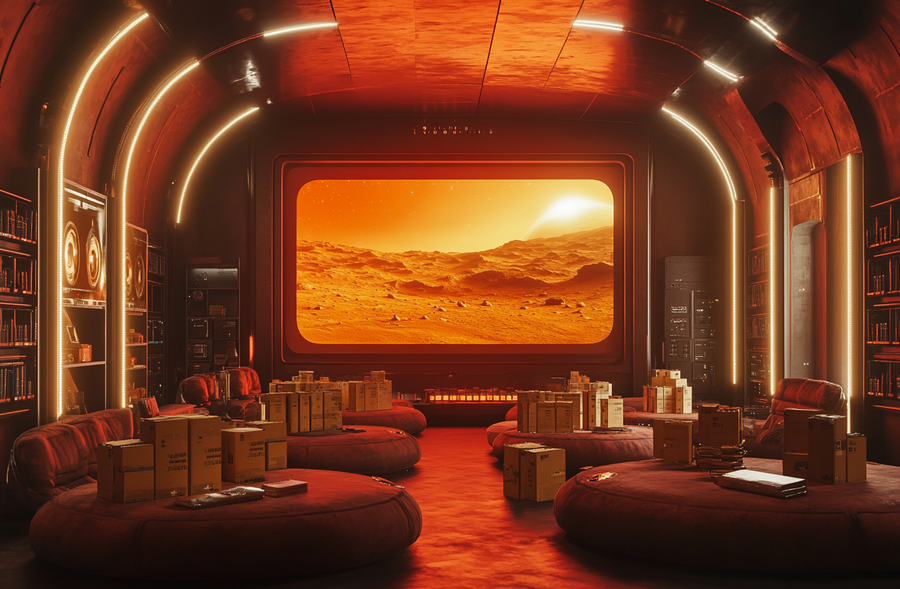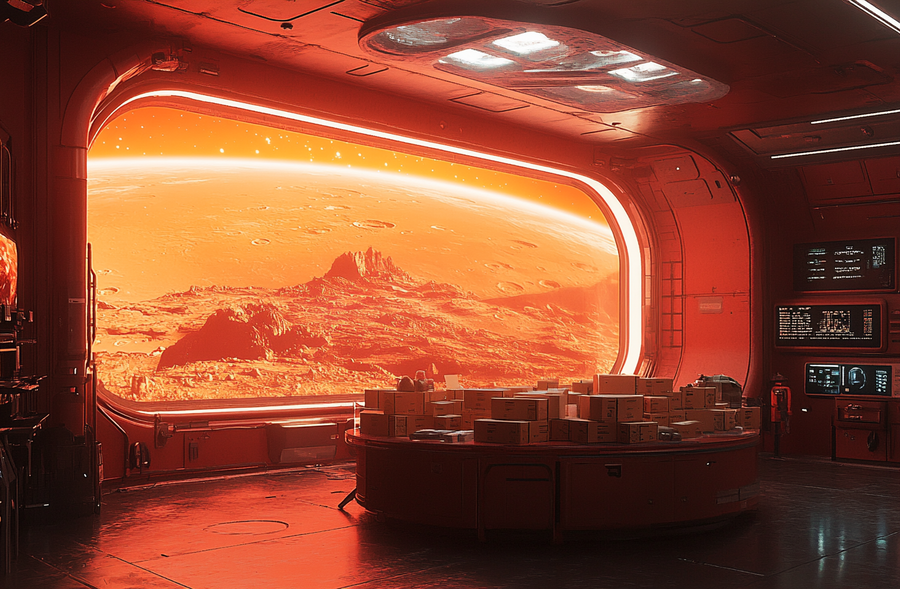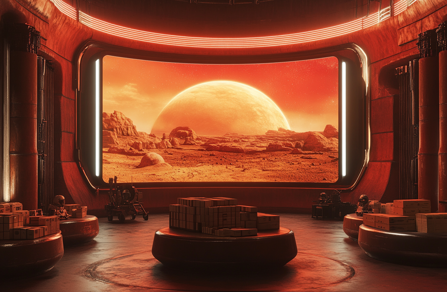Промт: Realistic interior design of a space goods store. A small red room with a glowing curved screen-wall. On the screen is an orange-pink landscape of Mars. In front of the screen are lunar craters-tables. On them are boxes — space goods. The walls are rounded. The walls and ceiling are dark red. Corona render --ar 20:13