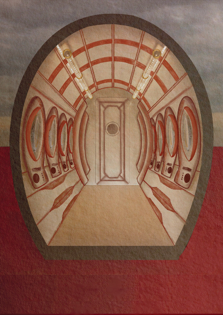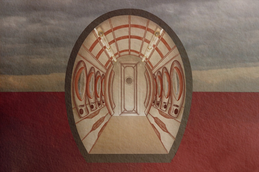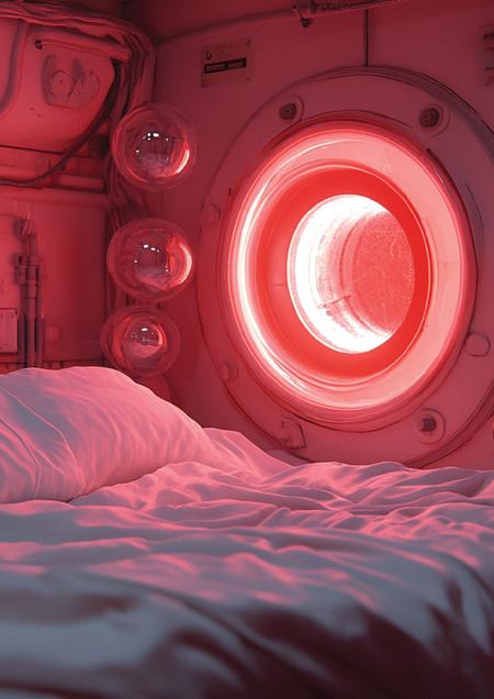 Промт: A red neon light illuminates the interior of an air tank with multiple buttons and round windows. A white fabric sheet is stretched over it, and several glass spheres of different shapes stand on top of the bed. The whole scene has the appearance of being made from plasticine, and the lighting casts shadows around the room, creating a mysterious atmosphere. The overall mood evokes a feeling of calmness and tranquility, with a color palette that includes shades of dark gray and soft pink. --ar 128:85