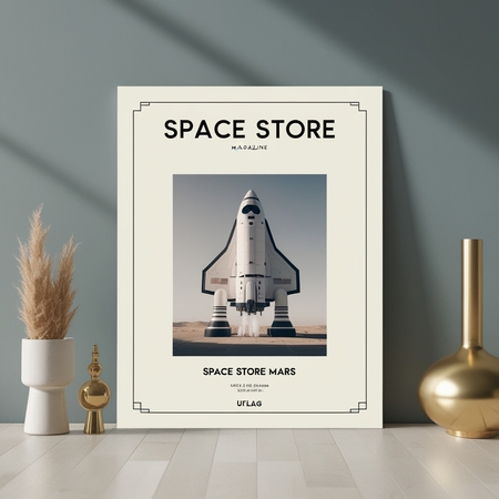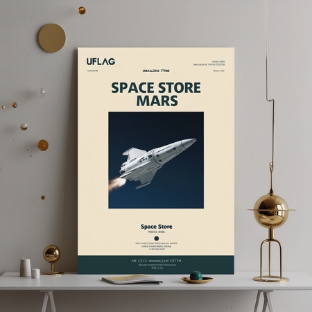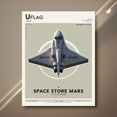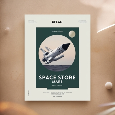 Промт: space store magazine cover with flat colors, minimalist design of the series «Uflag», calm colors, with white space around the photo of the spaceship, the text says «space store Mars», at the bottom of the poster in small font the information about the store is written, art deco posters, grainy film filter, high contrast, natural light, golden hour, color correction, light leaks, light halos, LUT, 35 mm film footage, retro