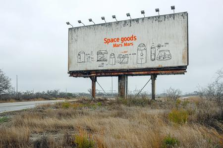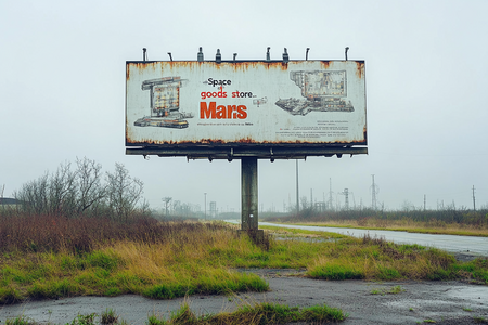 Промт: A large blank billboard in the middle of an empty field surrounded by nature and grass, grey sky, industrial brutalist architecture, minimalist concrete panels, raw concrete textures and enough space at the top for the text «Space goods store. Mars». The billboard shows an advertisement for a space goods store. The billboard is made in sand tones with the addition of orange. The word «Mars» on the billboard is easy to read. There are drawings of spaceships, spacesuits on the billboard. The image is photorealistic and hyperrealistic, shot with a Canon EOS R5 camera with professional color correction, soft shadows, low contrast and clean, sharp focus in a high-resolution photo. --ar 3:2