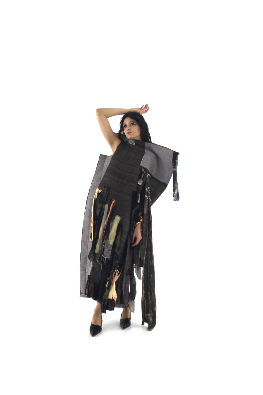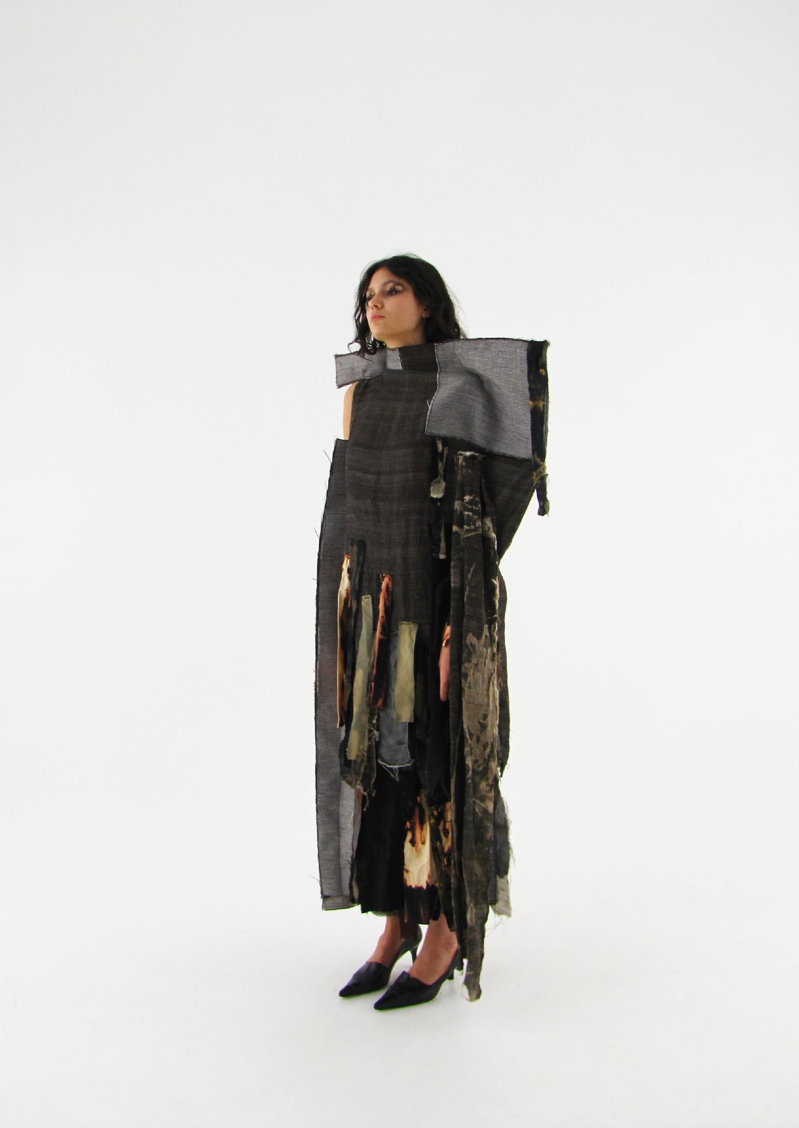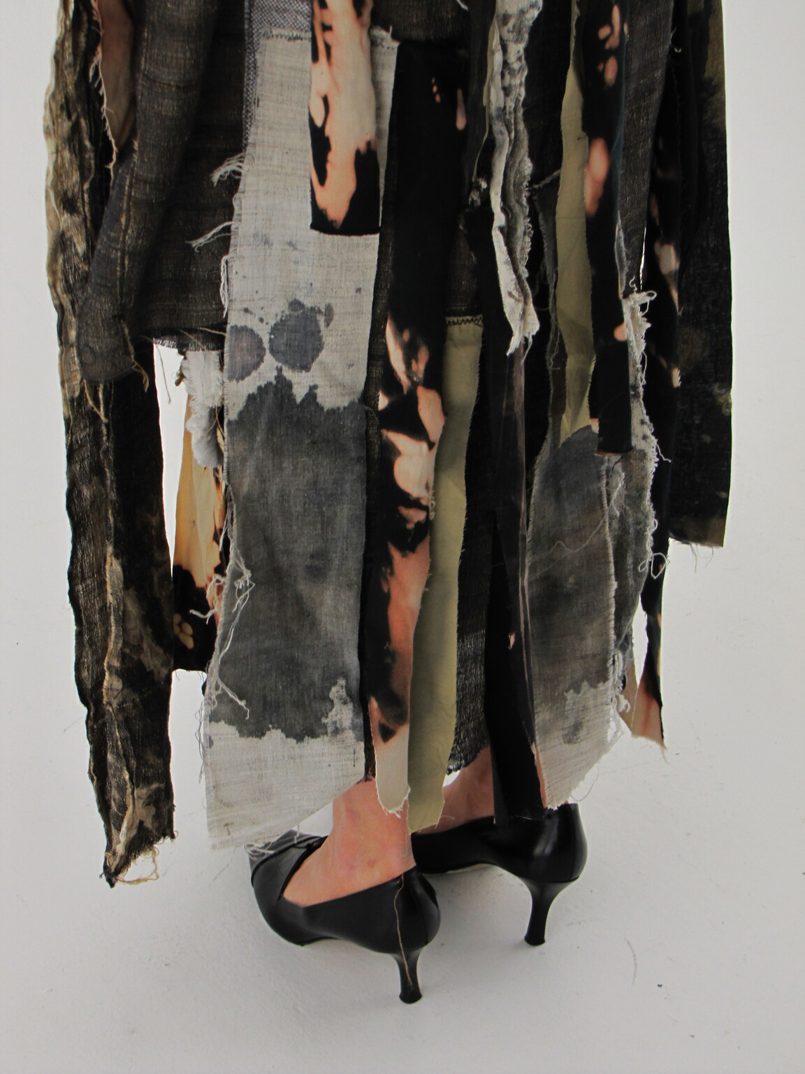 Изделие сочетает в себе замкнутую ограничивающую герметичную форму, подобную утилитарным постройкам, и разнообразную «рваную» текстуру, отсылающую к ощущению небезопасности.