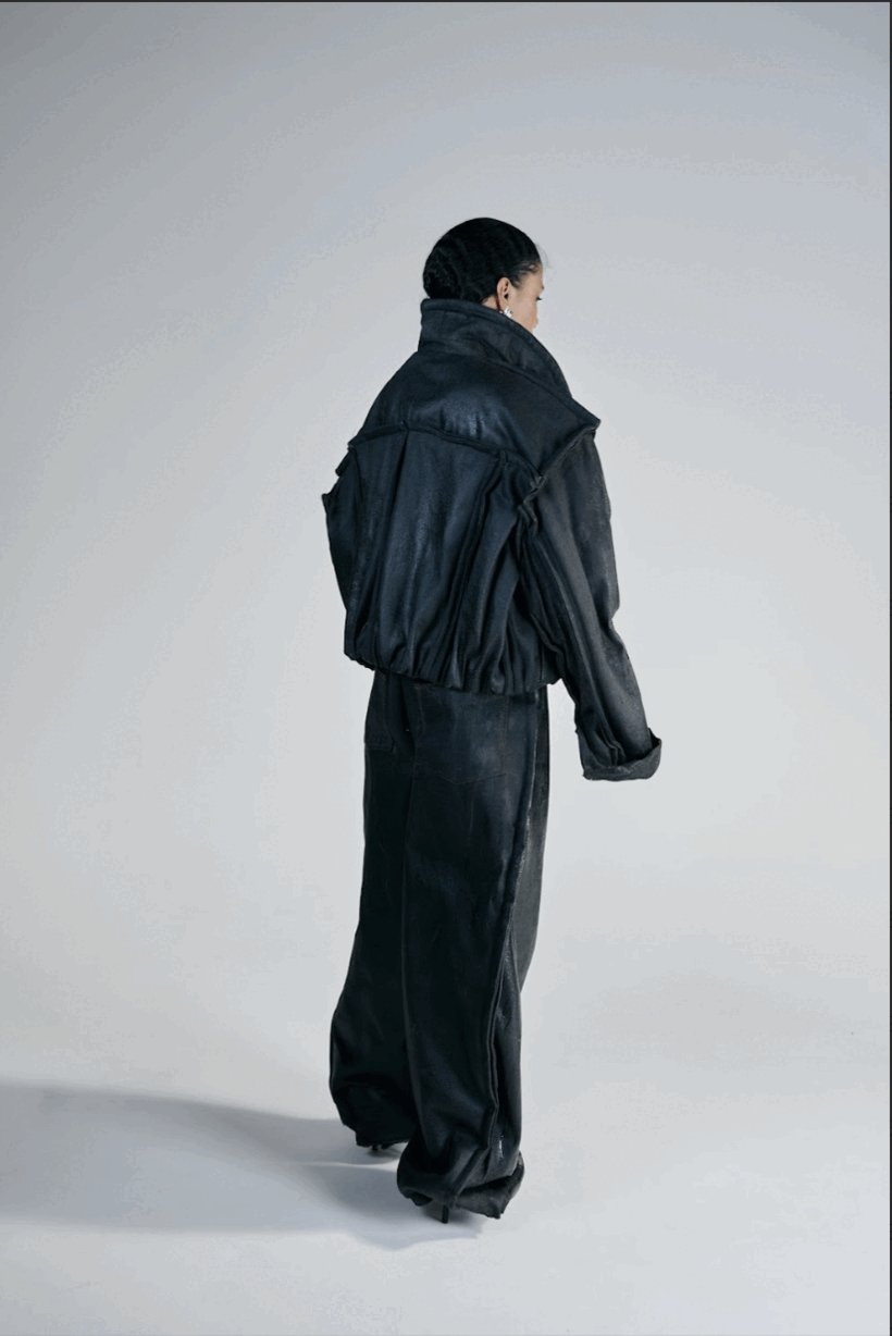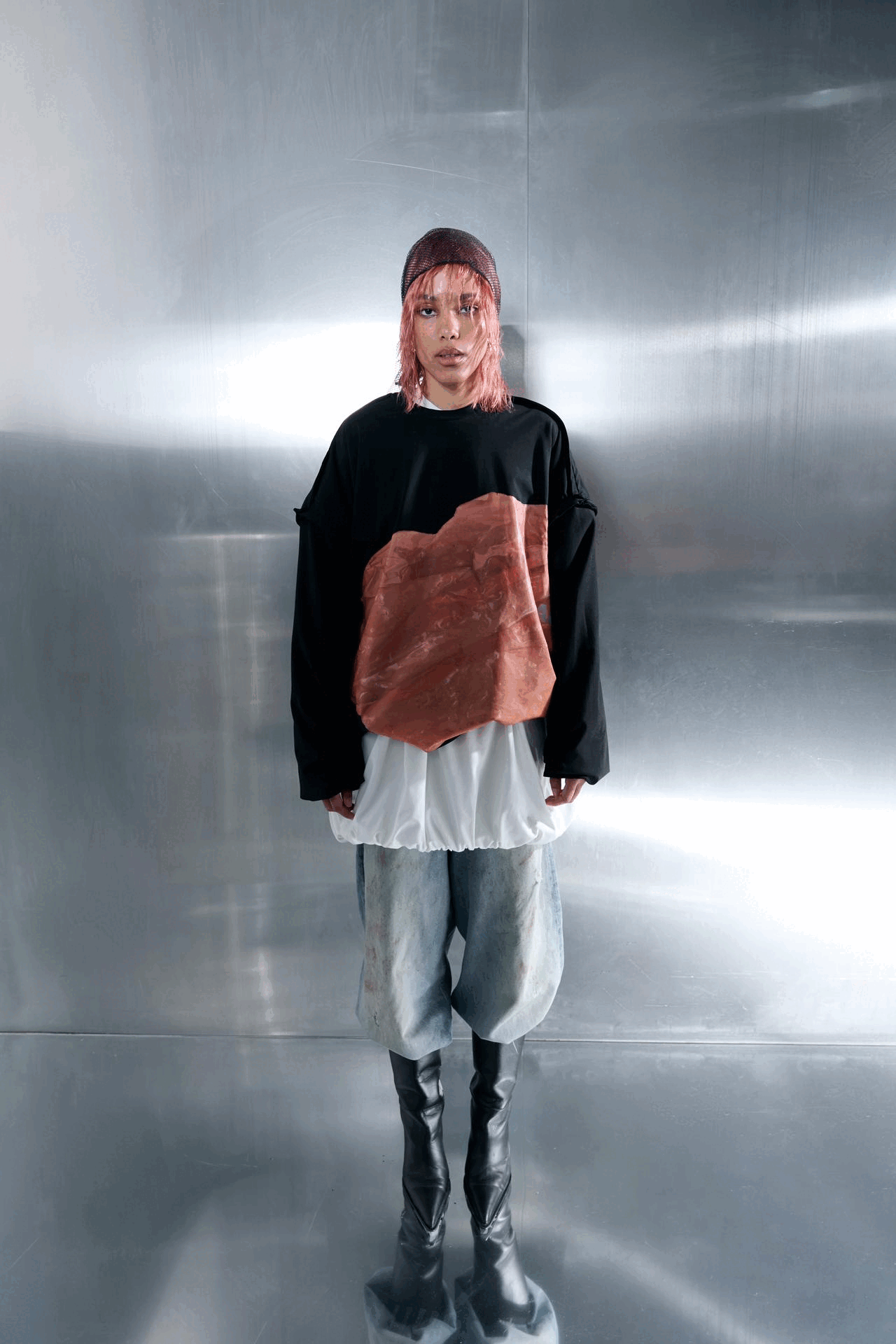 Джонни Йоханссон, креативный директор Acne Studios, часто обращается к современному искусству, как к главному источнику вдохновения. Стул от Гаэтано Пеше, созданный в 70-х годах, отражает концепцию свободы формы и эмоционального воздействия в дизайне. Главный предмет коллекции — джинсовый костюм с грубыми, нарочито торчащими швами и залитый смолой, что придаёт ему скульптурный вид, словно застывший в движении. Эта обработка добавляет драматичности и создаёт иллюзию массивности, словно одежда — это не просто вещь, а скульптурный объект с историей.