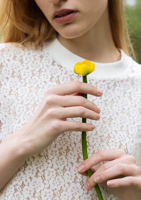 Героиня бренда использует бабушкины тюли как одежду, чувствуя себя ребенком: бегает босиком, пачкает платье, созерцая природные мотивы.