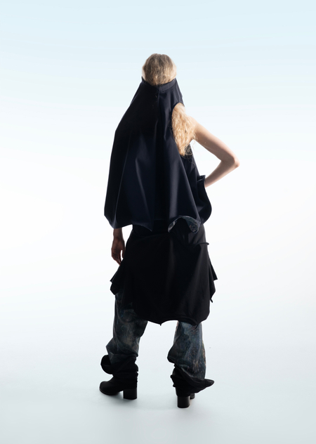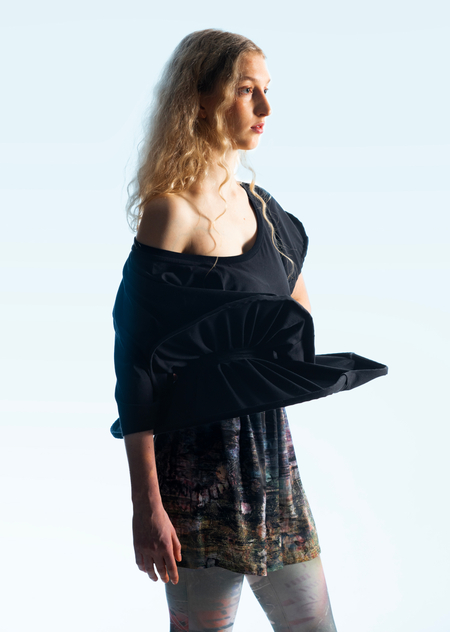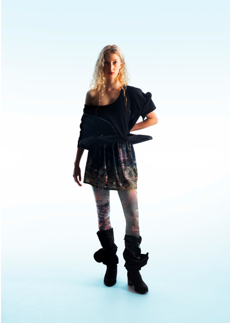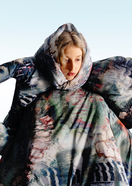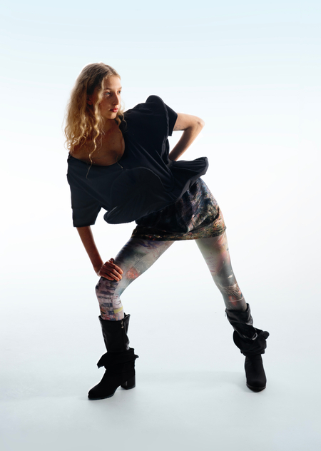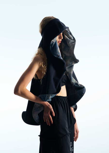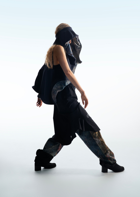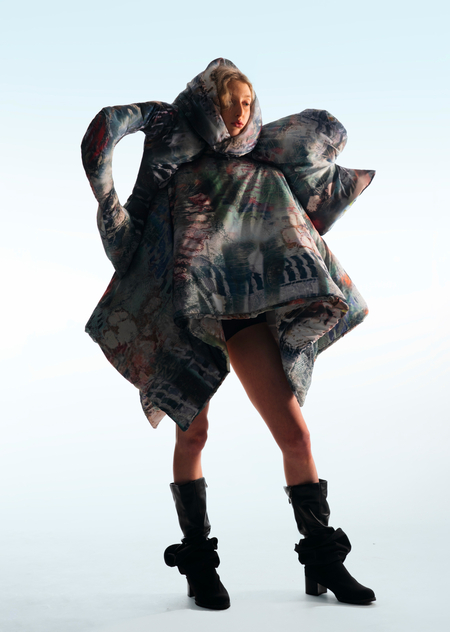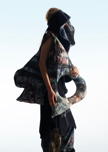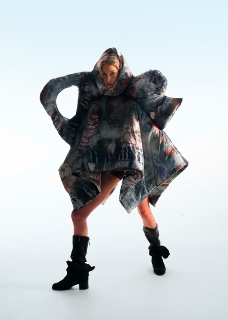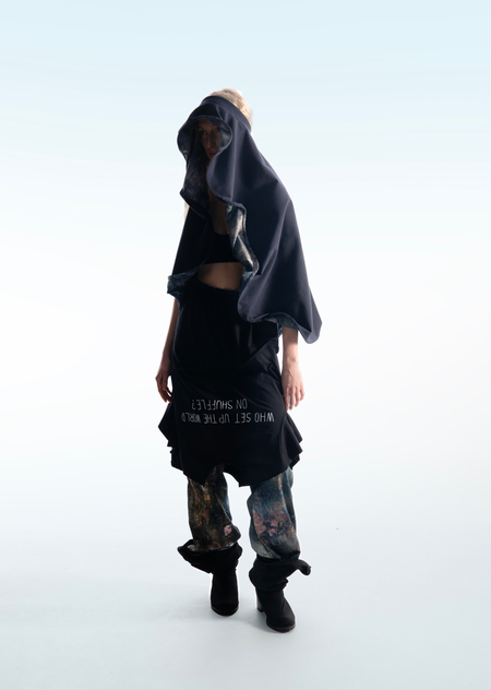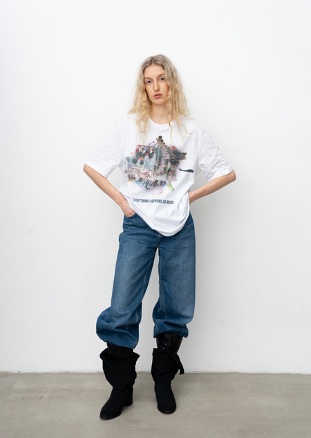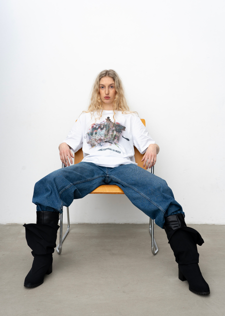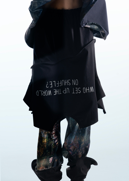 Город становится площадкой для этого хаоса, местом, где он множится и раскрывается новыми гранями. В основу принта легли мои эксперименты печатной графики и элементы городской среды, а лозунги отражают состояние человека, растворенного в бескрайних просторах неопределенности.