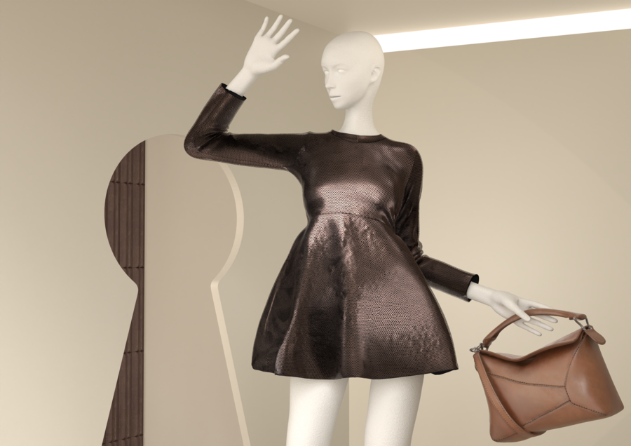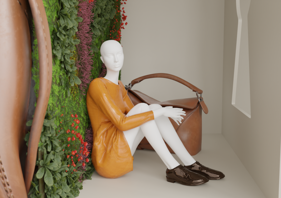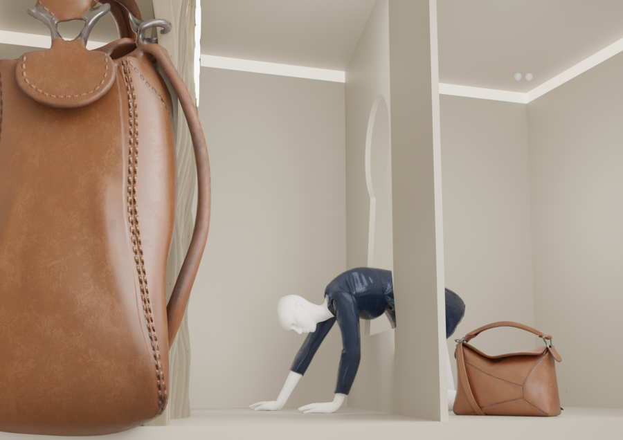 Витрины воплощают диалог между двумя мирами: миром природы и ремесла, и миром творений LOEWE. Замочная скважина в стене становится символическим порталом, приглашающим зрителя в уникальную вселенную бренда, где традиции ручного мастерства встречаются с актуальной модой.