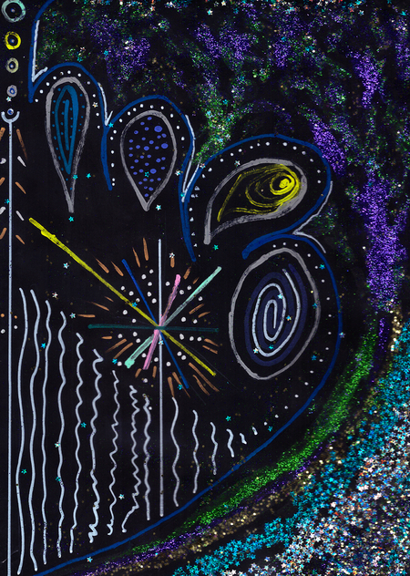 Партитура данной импровизации вдохновлена работой чешского композитора Miroslav Ponc (см след слайд) Синестезия — слияние звука, цвета и форм, в моей работе расположились в виде классической формы развития — спирали. от ритмических пульсаций, зарождающихся в левом верхнем углу, звук, проходя через (предположительно) басовые колебания, нарастает и, обрушивается на центр композиции — искрящуюся и пульсирующую линию центрального инструмента — вокала. мерцающие металлизированные сегменты создаются буквально — металлическим, искрящимся/shimmering звуком. отдельные крупные — капли волны — дополнительный вокал и перкуссионные элементы, существуют в формате заданных текстур, представленных в четырёх крупных каплях. Чёрный фон представляет собой непрерывное шумовое заполнение, ассоциированное с пространством Космоса. Все элементы (кроме чёрного фона) — звучат импульсно — то есть вступают и останавливаются по разумению исполняющего, в согласии с общим настроением композиции и её динамического состояния в моменте.