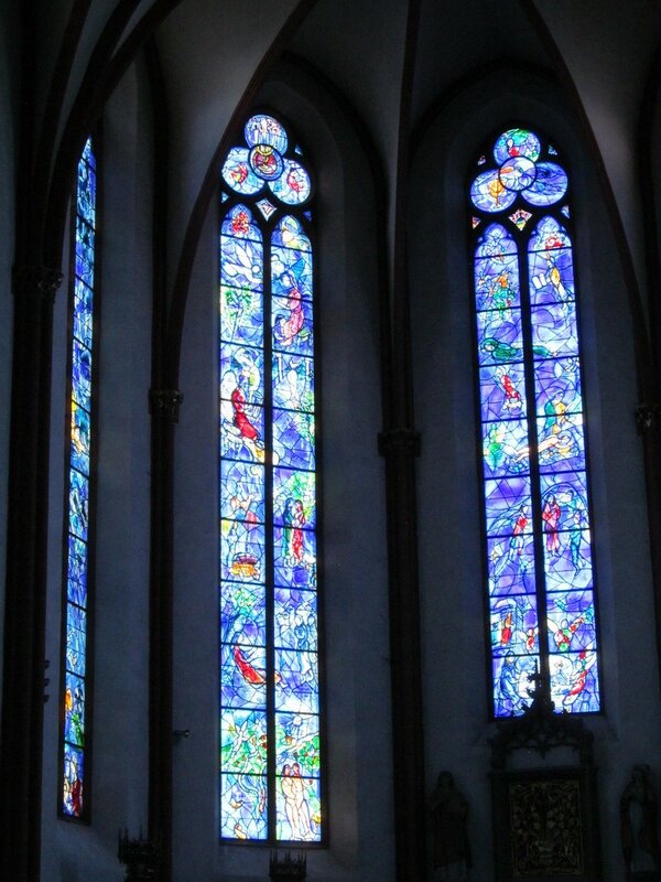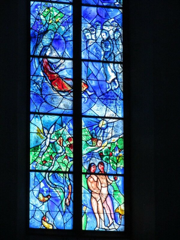 В отличие от синагоги, здесь Шагал возвращается к фигуративности, изображая ветхозаветные сюжеты, общие для иудеев и христиан. Однако фигуры растворяются в синем мареве, становясь почти бесплотными духами. В работе над этим циклом Шагалу помогал его ученик Шарль Марк, создавший орнаментальные дополнения, что позволило интегрировать витражи в восстановленную готическую архитектуру.