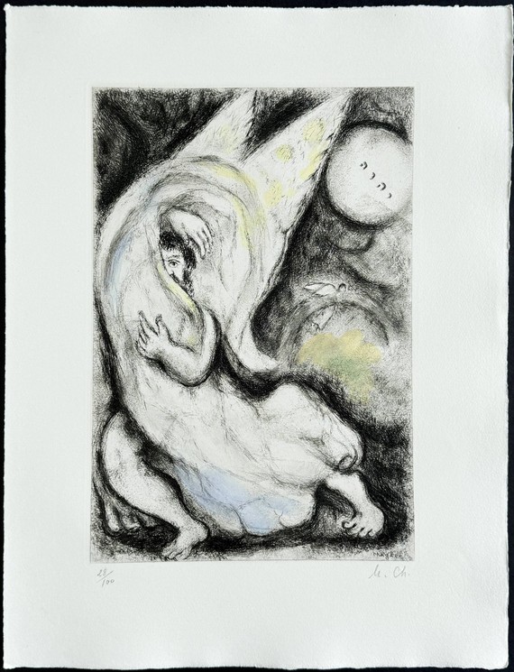 В 1955 году Библия с иллюстрациями Шагала наконец увидела свет, а последовавшие выставки в Париже (1956, 1960) закрепили за этим циклом статус канонического и получили признание публики. Работа над офортами создала жесткий иконографический каркас, который в поздний период творчества (рассматриваемый в следующих главах) позволит Шагалу перенести эти сюжеты в монументальный масштаб.