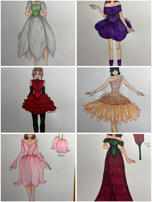 Эскиз платья выполнен в виде цветка розы: пышная юбка состоит из объёмных ярусов, имитирующих слои лепестков. Образ дополняют чёрные перчатки и колготки в сетку, а ботинки выполнены в зелёном цвете с красными носками, напоминающими стебель и бутон розы. Общий стиль — романтичный и выразительный, вдохновлённый природной элегантностью цветка.