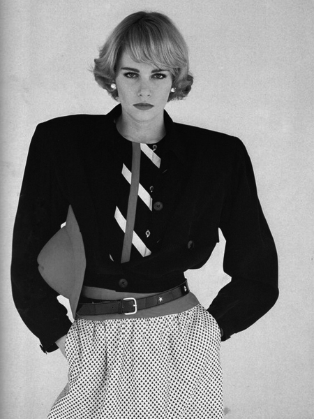 В деловом дресс-коде визитной карточкой человека становится его внешний вид. Эту стратегию на вооружение взяли те, кто в восьмидесятые начал именоваться «яппи». Яппи (Yuppie), — это аббревиатура Young Urban Professionals. Ими могли быть как мужчины, так и женщины. Яппи очень любили деньги: и зарабатывать, и тратить. Деловой костюм для них — символ жизни. Именно поэтому им полюбились бренды, которые занимались новыми концепциями в деловой одежде. Для деловой моды 80-х характерными стали консерватизм и ностальгия по 50-м, но в спокойной обстановке. Консервативность определялась достаточно спокойным политическим и экономическим фоном, ведь завершается холодная война.