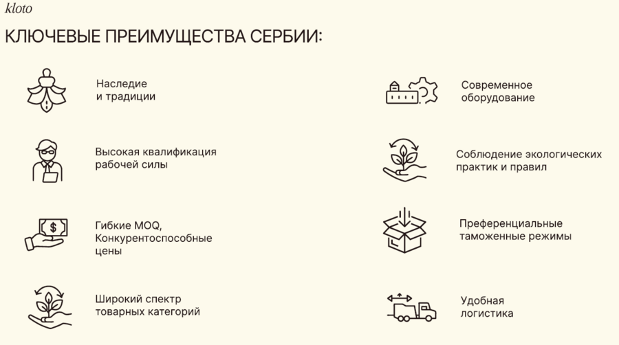 Команда Kloto помогает компаниям в разных точках мира находить стратегические решения для развития. Работает в сферах fashion, beauty, wellness. Компания настраивает все бизнес-процессы для брендов, которые к ним обращаются. Kloto сотрудничает с разными странами, но в основном — с Сербией.