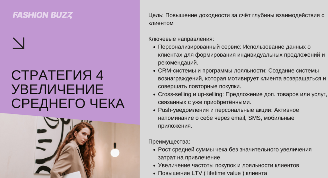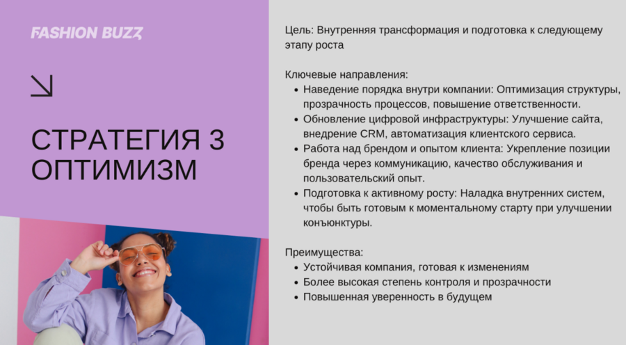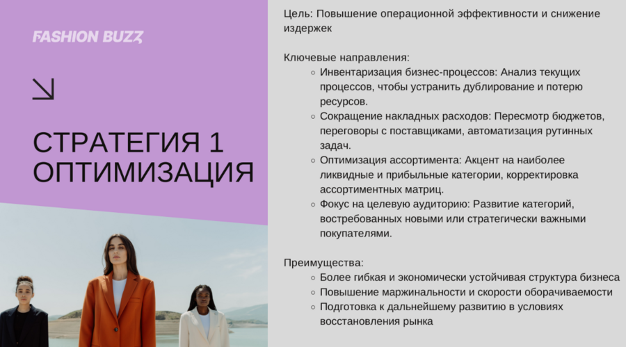 Чтобы усилить эффективность каждой модели и коллекции стоит решить, какие условия для клиентов и компании будут самыми выгодными. Важно не забывать поощрять свою команду и вдохновлять на достижении запланированного результата. В условиях современного рынка важно быть гибкими и уметь подстраиваться под любые кризисные ситуации, сначала тестируя все процессы.