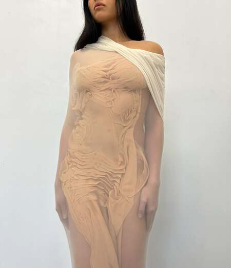 «Голое платье» Наибольшую известность марке принесли модели, сконструированные из многослойной полупрозрачной ткани с акцентом на сложные драпировки. Эта техника создает эффект обнаженности при сохранении визуальной целостности и художественной выразительности образа.