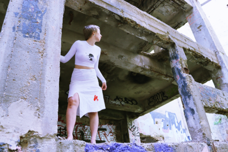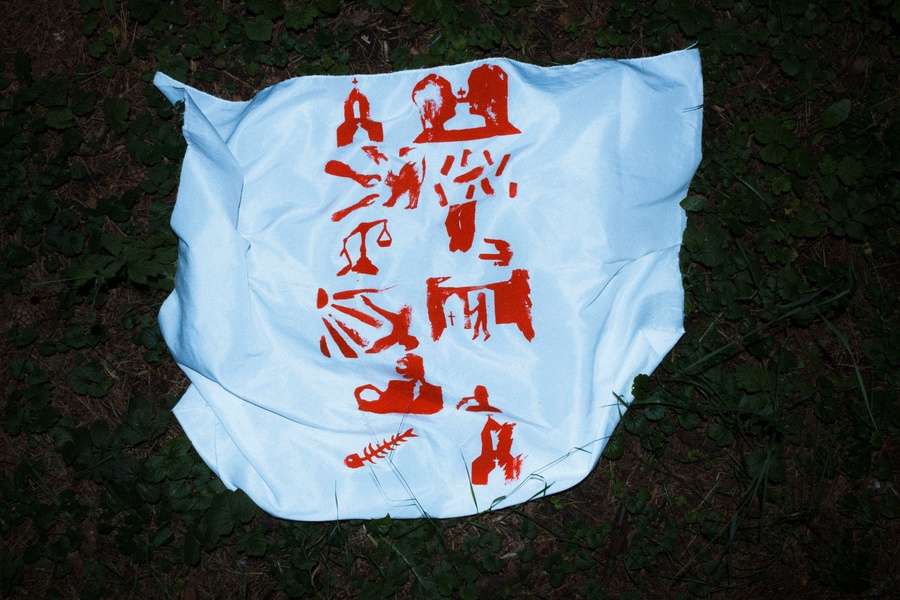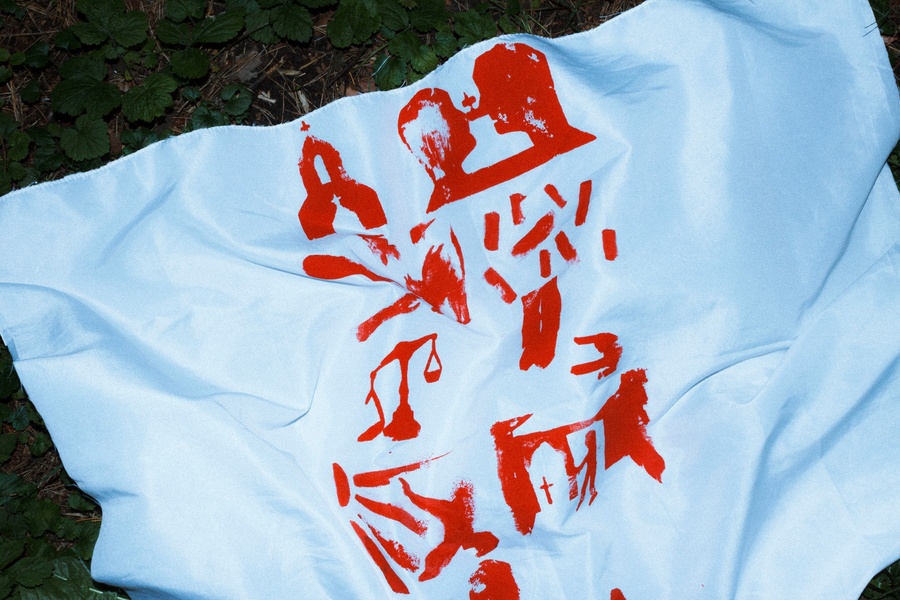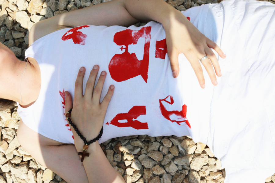 Для шелкографии был выбран в основном красный цвет на белой одежде с отсылкой на эпизод смерти диктатора