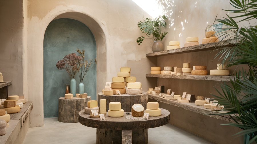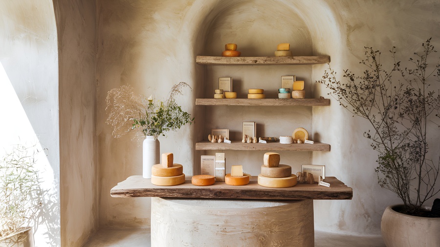 small concept store selling some craft cheese plus culinary books and other merchandise of cheese museum, trendy interior design, minimalistic, rough plaster on the walls, soft natural light, creamy dusty soft color palette, soothing beige and brown shades with some elegant dusty blue, rough wooden shelves, interior evokes a sense of sophistication and modernity, with a focus on the beauty of simplicity, natural atmosphere