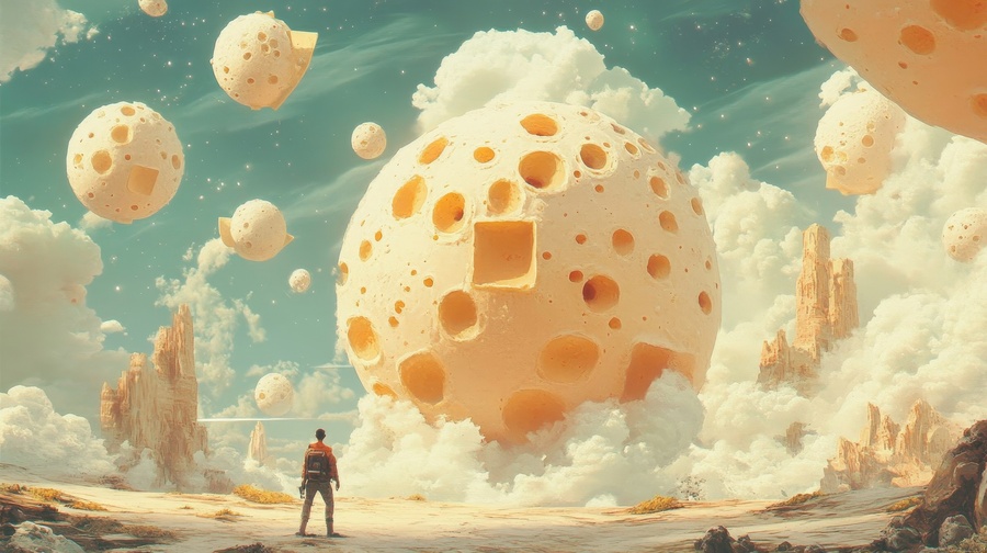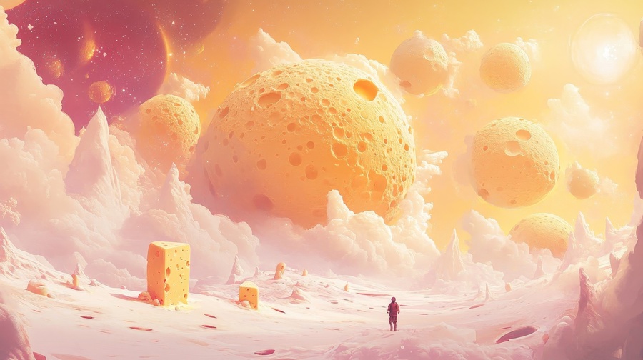 concept art, surreal sci-fi art, planets made of cheese, huge cheeses floating in space, cheese cosmos, creamy dusty color palette, soft style, retro comic book style, pastel color scheme, balanced composition --ar 16:9 --v 6.1