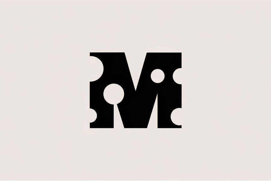 bold sans serif simple strict letter M with a few asymmetrically positioned random holes of different sizes like cheese, contemporary clean design, vector logo, flat 2d icon, without shadows, beige color, white background, minimalistic, elegant, concise, low details, beige letter on white background
