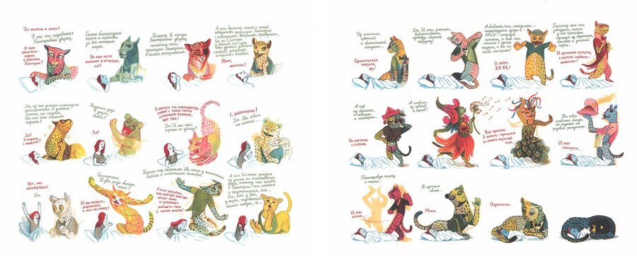 Все это говорит о том, что Брехт Эвенс в своем произведении изображает цветом несколько миров: реальный и фантазийный, а также столкновение их в конце. С помощью развития смыслов, вложенных в ту или иную палитру иллюстратор двигает историю вперёд, раскрывая персонажей. Именно поэтому книгу закрывает панорама, которая хитро прячет за жестокостью и ужасом, которые пережила Кристина, красивую и яркую Пантерию, которая лишь приманила ребенка, не дав того, что обещала.