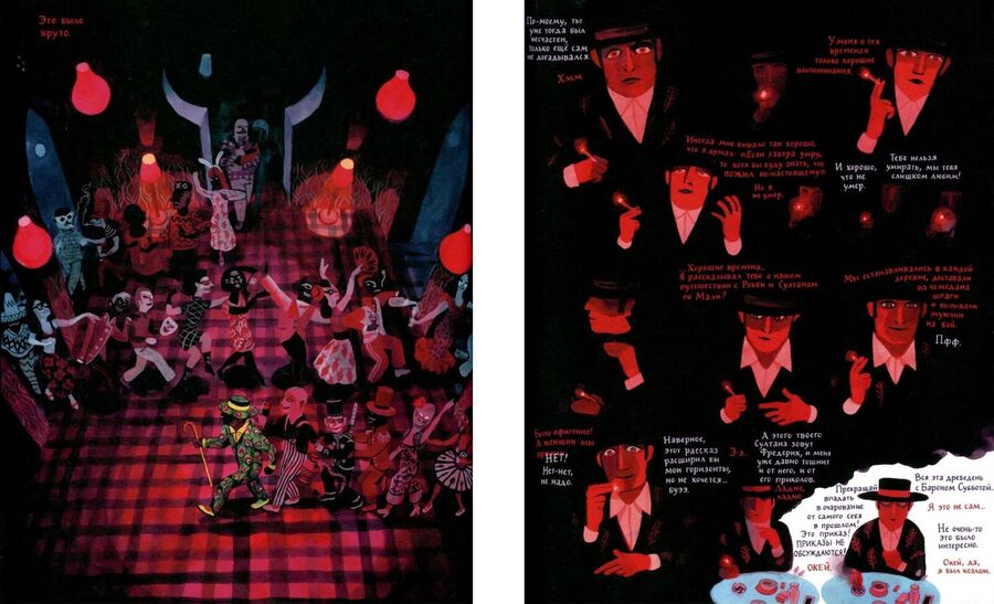 По прочтении сталкиваешься с выбивающимся из общего строя разворотами. Какой бы не был яркий визуальный ряд, взгляд притягивает неожиданный монохром, в необходимые для автора моменты.