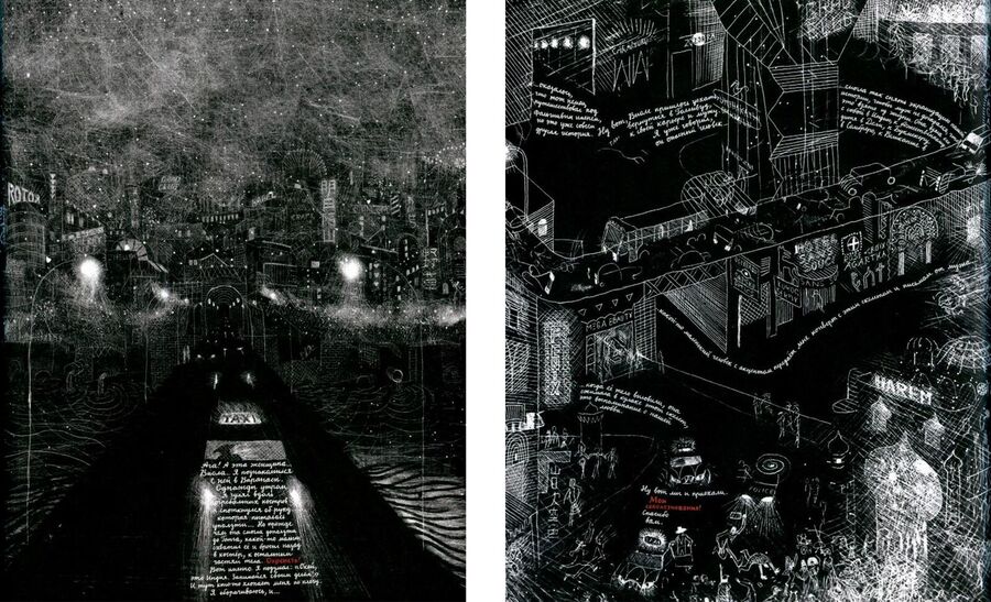 Черно-белое изображение используется иллюстратором, чтобы застать читателя врасплох и наиболее ярко выразить ощущения героев. Это достигает своего пика влияния в ряде цветных иллюстраций.