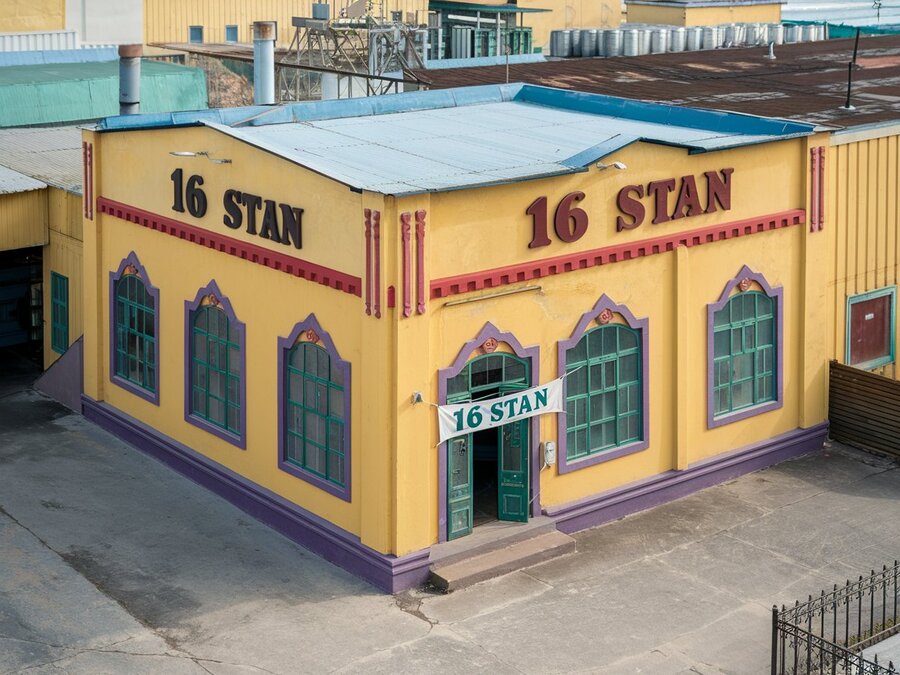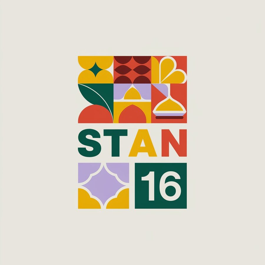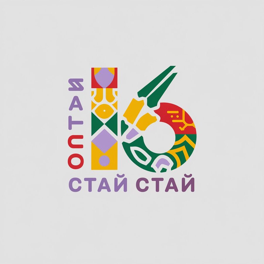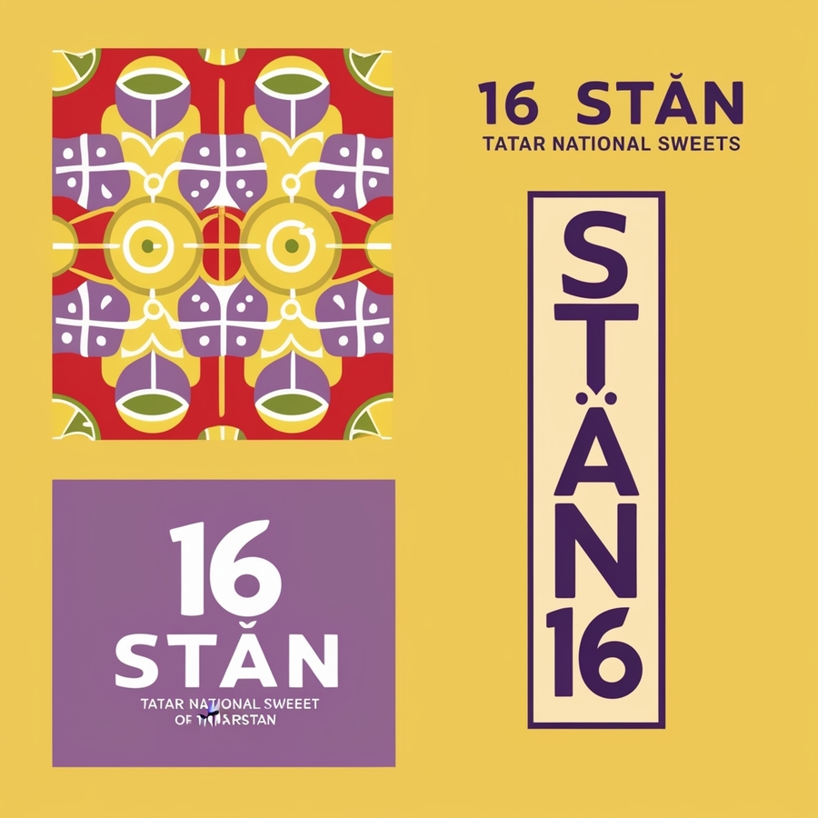 /imagine prompt: Create me a logo for a brand that produces Tatar national sweets. Company name «16 СТАН», main colors: Lemon, scarlet, lavender, green.In one — a flat pattern of elements of chak-chak (national dish of Tatarstan), in the second — vertically written word «СТАН» and the number 16