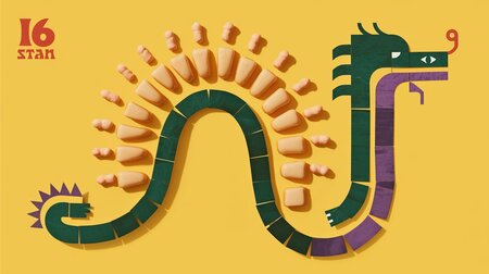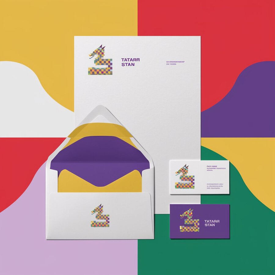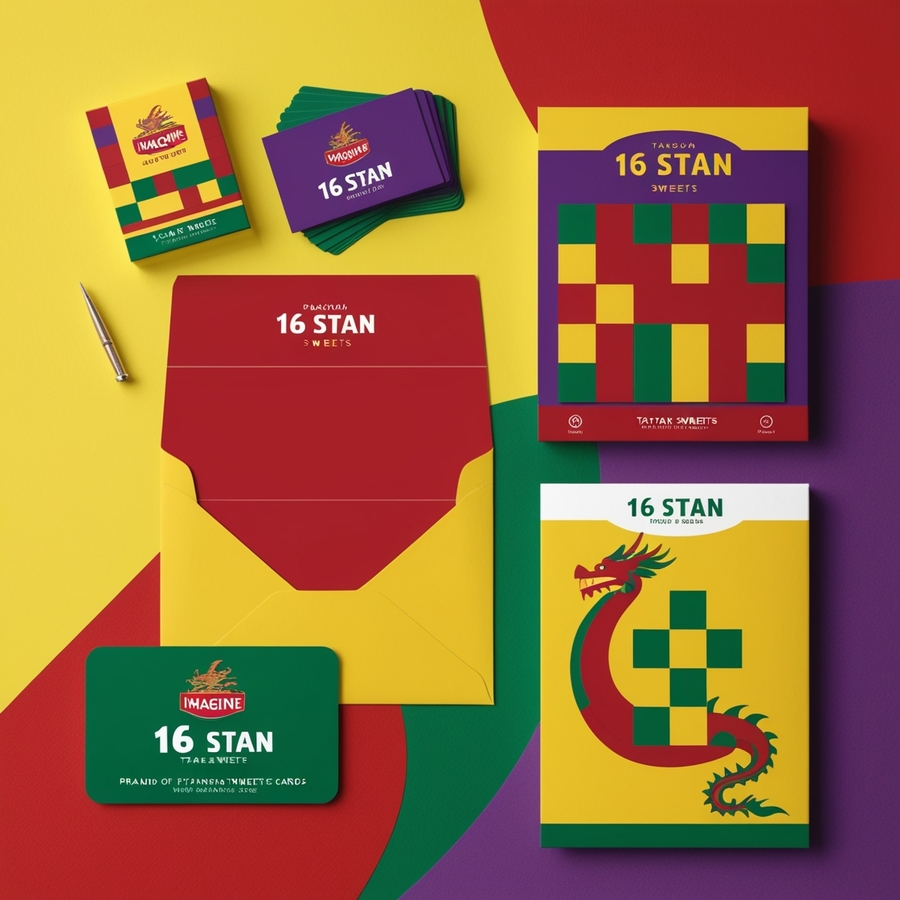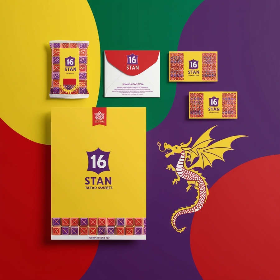 /imagine prompt: create a layout of printed products (paper, envelope, business cards) on a yellow, red, purple, green background for the brand of Tatar sweets «16 STAN». one of the graphic elements, the image of a dragon without head and wings, created from the repetition of layering squares on each other on a curved path.