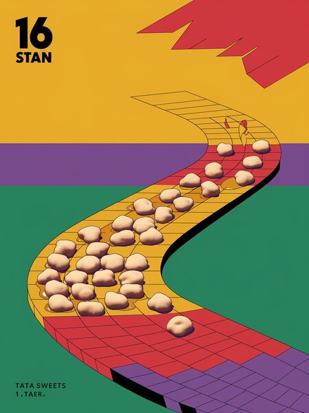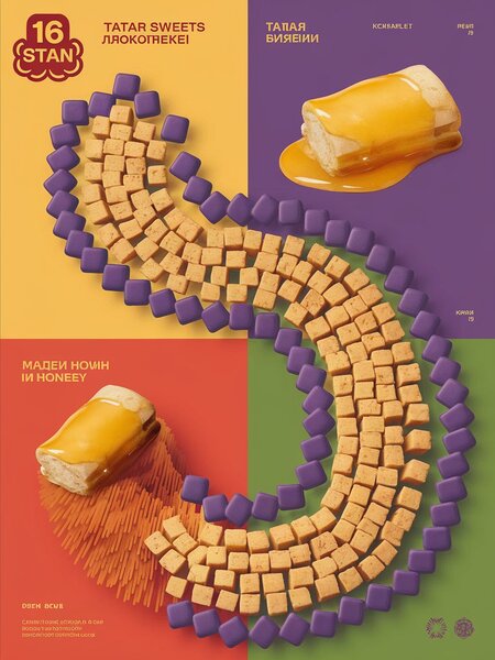 /imagine prompt: create me a poster for the brand of Tatar sweets «16 STAN», where the main element will be national Tatar sweets (a slide of small pieces of dough in honey) as well as curved path a without wings and head (layering a large number of squares on each other on the trijectory of curved line) use in the entire poster only 4 colors: yellow, scarlet, purple, green. The poster should have the «16 STAN» logo. Add typography
