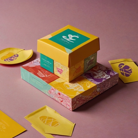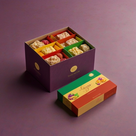 /imagine prompt: Generate me a package for NATIONAL sweets. the package should have a square logo «16 STAN”(THIS LOGO MUST BE ON THE PACKAGE), the main colors of the package: yellow, scarlet, purple, green. MODERN, MODULAR DESIGN: dragon without legs, made in the form of layering of squares on top of each other on a curved path.