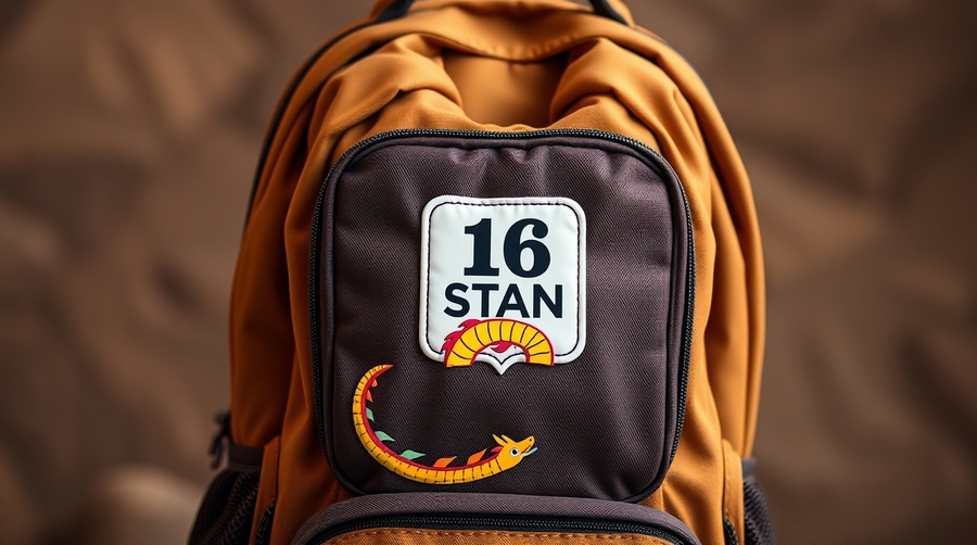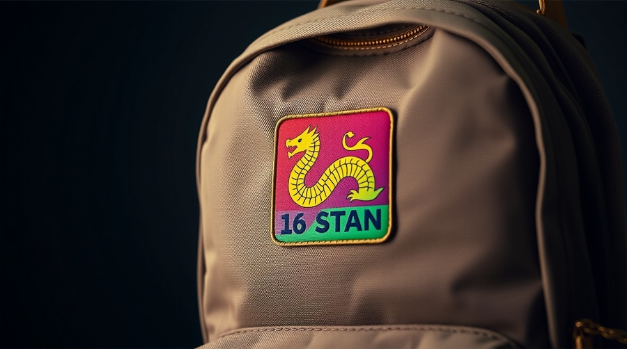 /imagine prompt: backpack with the logo of the brand of Tatar sweets «16 STAN». where the main element of the brand is a squared logo «16 STAN» and a long dragon without head and wings and legs colors: yellow, scarlet, purple, green.