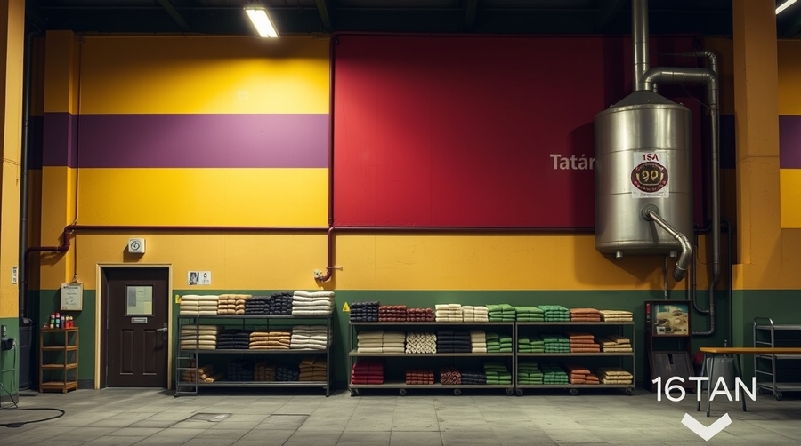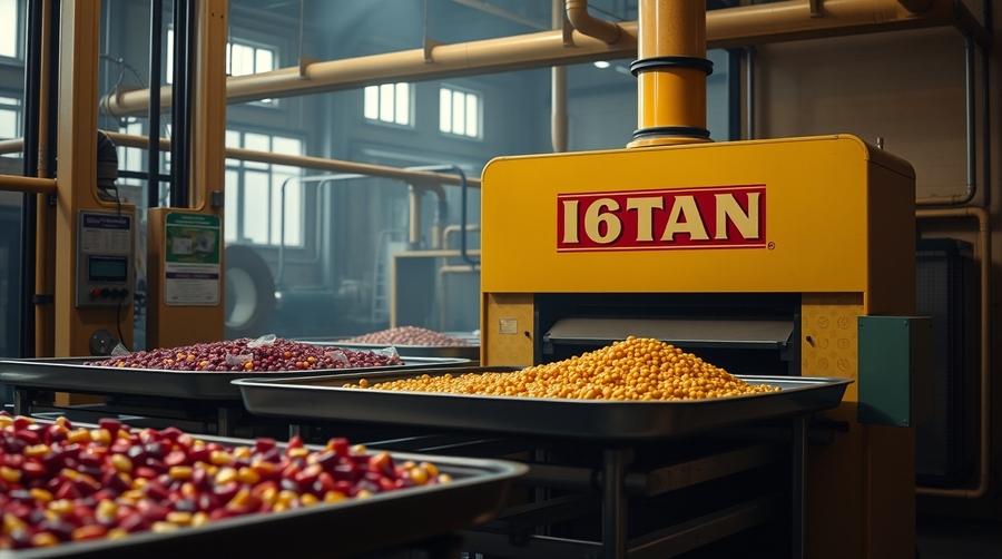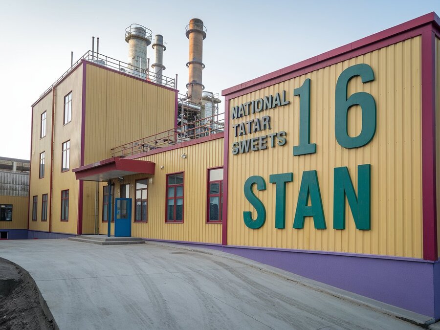 /imagine prompt: generate me a factory to create national Tatar sweets of the brand «16 STAN», the colors of this factory: yellow, scarlet, purple, green.