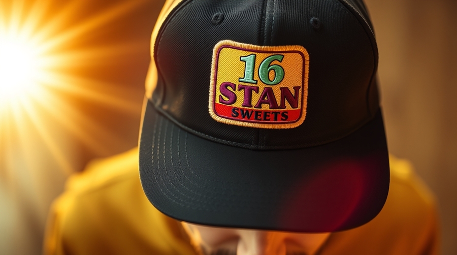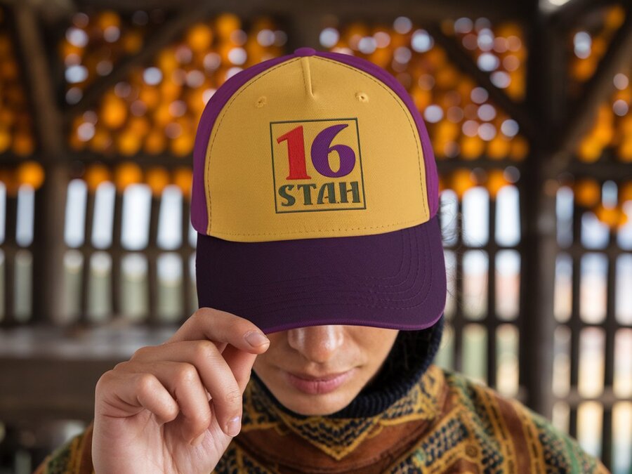 /imagine prompt: cap on a person with the logo of the brand of Tatar sweets «16 STAN». where the main element of the brand is the QUADRATE logo «16 STAN» colors: yellow, scarlet, purple, green.