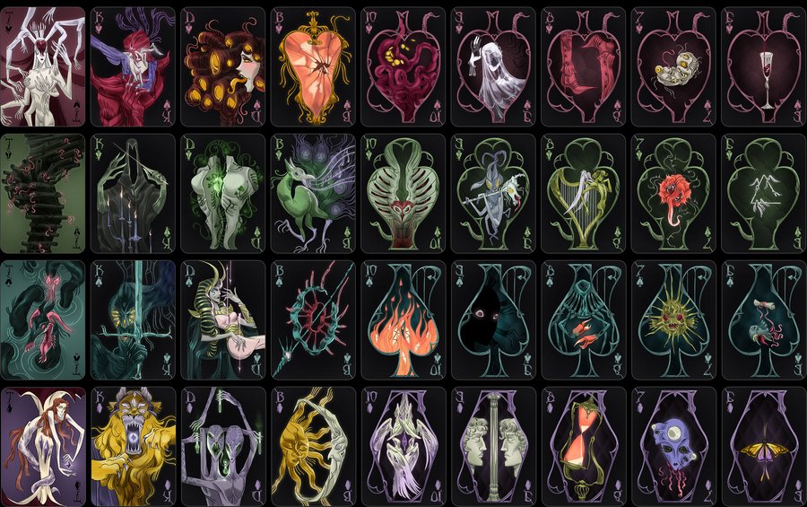 Пики: война, оружие, насилие Трефы: искусство, природные силы Червы: страсть, богатство Бубны: наука, прорицание