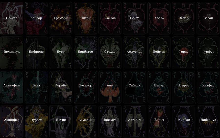 Червы: Белиал Бубны: Люцифер Трефы: Вельзевул Пики: Левиафан
